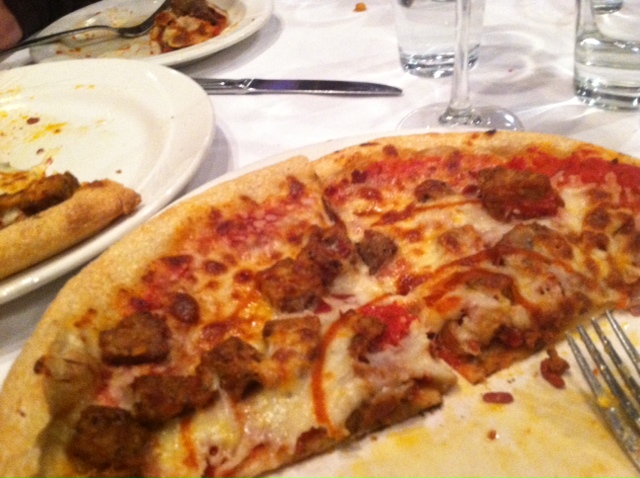 Which probably all worked out for the best, because Amanda ordered Ted’s worst nightmare, the pizza made entirely of a million kinds of cheese. Seriously, while delicious, I think this pizza could turn a person lactose intolerant just by looking at it. Shane and I both had the one with chorizo sausage, and Ted went with the blackened chicken/tortilla one. And in case I haven’t said it already, everything was delicious. And filling. I mean, Ted actually only ate half his pizza and had to get a to-go box, which I think was a first in WTGW history. And, following the great Market Tavern Pizza Challenge of a few weeks ago, Amanda threw heroics to the wind and took more than half her meal home as well. Smart move.
