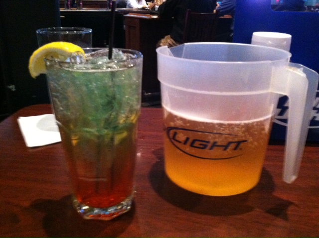 Another thing to note is that on Wednesdays all of the Long Islands are $3.50. I say “all,” because they apparently have varieties. Although we didn’t actually hear what they are, because Shane cut the bartender off after the first one and just told her to “surprise him.” And if we didn’t get properly stared at when we walked in, we certainly did once his fruity looking red and green Long Island showed up … along with mine and Amanda’s pitcher of Miller Lite for $5.00. Nice. I will also mention that said beer came with some of the coldest glasses ever, although it would’ve been nice to have them refreshed throughout the meal. It would’ve also been nice to have been given silverware and napkins with our meal as well, but I don’t want to seem too needy. I mean, really.
