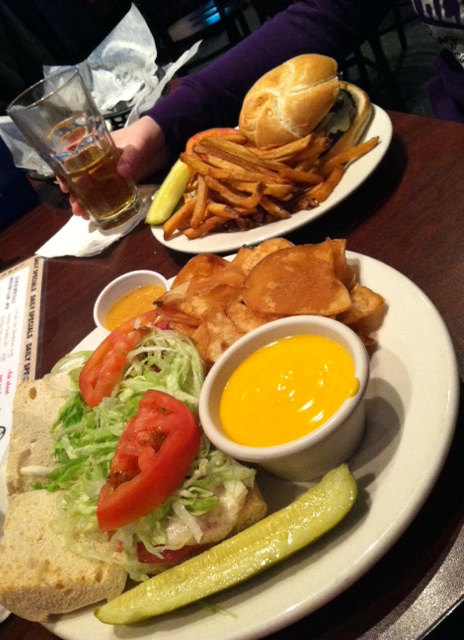 I ordered the Italian hoagie, which is served hot or cold, so I chose hot. I ordered chips as a side, no dips come with it but the waitress suggested ranch or nacho cheese. I took the cheese, and ended up with I think more of that than the chips. But it was delicious, so score. Amanda had a burger and fries, which she seemed happy with.