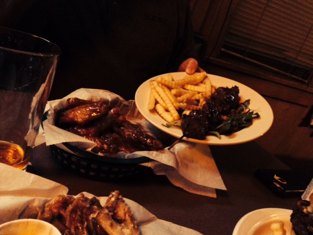 Ted also went with the wing special, along with sides of fries and steak-on-a-stick. If only those had been fair fries, he would’ve been reliving a summer day at the county fair over there on his side of the table. He made yummy noises all through eating the steak-on-a-stick, so he was clearly happy with it. And for like $4 how can you not be? He almost ordered another one just because.
