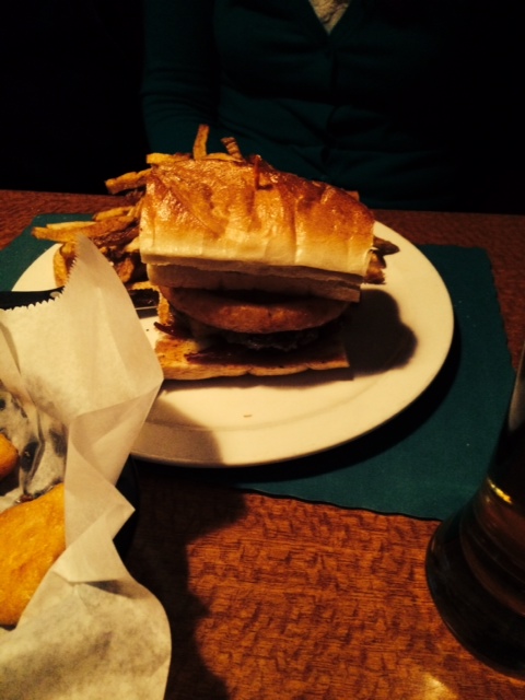 Ted had the jalepeno burger. He had been set on Cajun pasta, but after reading about that partiluar burger (rather, after I read aloud the description for that particular burger, because I couldn’t believe they put that much heat on one sandwich) he called an audible. Amanda had the bullseye burger, which has onion rings and bacon, so how can you really go wrong? Plus did I mention the bread?