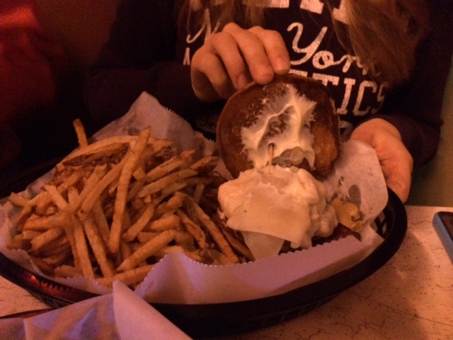 Now, to be fair, our waitress warned us that the actual meals – and in particular the burgers – were giant. But this was after we had already put in our appetizer order and she had come back to take our meal orders, so no take-backsey’s. And thanks for the head’s up. We had ordered pretzel sticks and onion rings, and basically should’ve just taken that money we paid for those and fed it to the hungry springs in the seats underneath us because we barely even touched either of them.