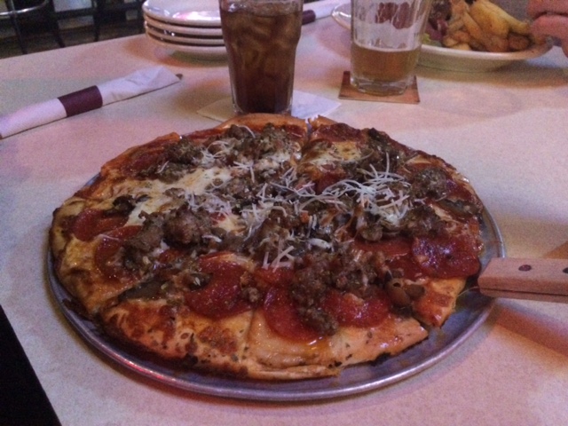 Shane decided to go with an old standby, the build-your-own pizza. He chose pepperoni, sausage, mushrooms and extra cheese. The waitress had told him when he ordered that the sauce was “kind of sweet” and … wait for it … “good.” But according to Shane, it was neither of those things. Hmmm. He said it was more like canned spaghetti sauce than anything else. And definitely not sweet. But also not salty, so I just they missed his meal with the seasoning de jour somehow.
