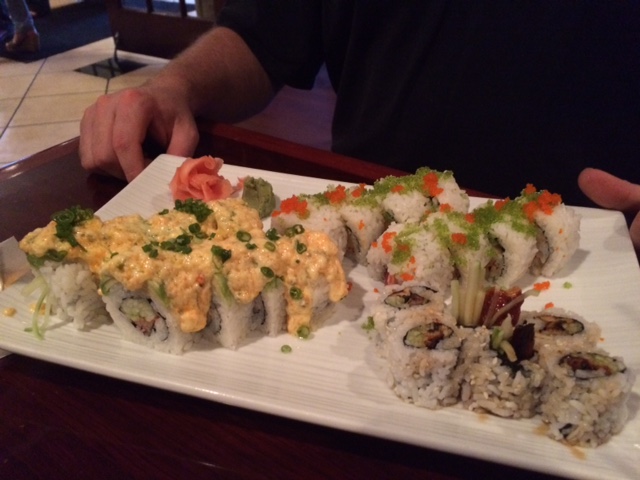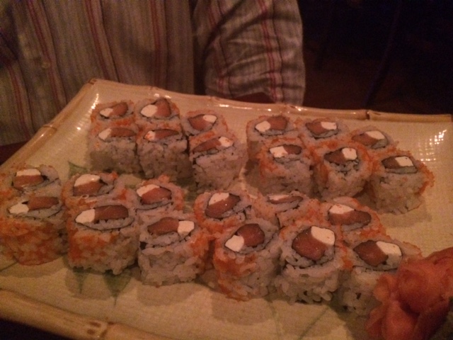Amanda got the Morgan roll, which had been deemed another of the faves, and of course a Philadelphia roll. She liked them both, but the Morgan roll was eight large pieces – which she wasn’t expecting – so it was a lot of food. And she couldn’t even offer it to the boys since Ted over-ordered and was stuffed, and Shane is allergic to shrimp. Backfire!