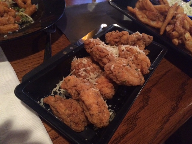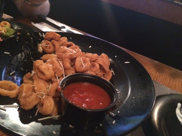Don’t feel too bad for them, though, because they did OK with their respective app selections. Shane ordered the fried poppers, which were also delicious. He actually talked Ted into trying one (gasp!) – and Ted then actually admitted he couldn’t really even taste the cream cheese, just the fried breading and the jalepenos (double gasp!). So, win. Although maybe he was just being nice since he and Shane were also sharing an order of calamari, and he didn’t want Shane to spit on his side of the plate.