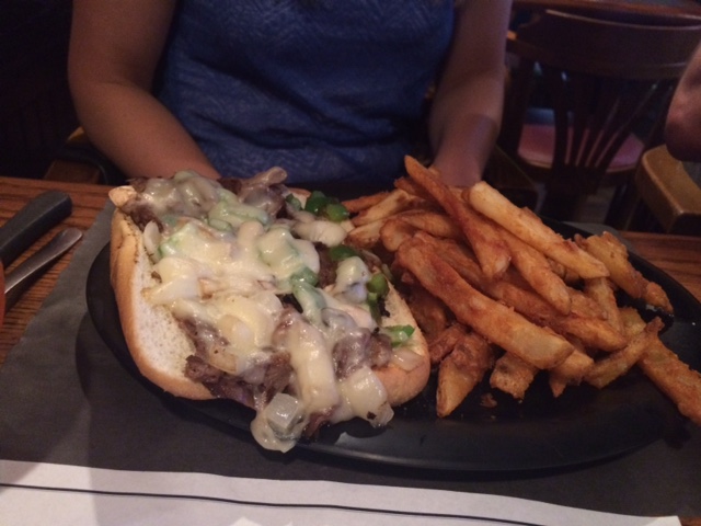 Amanda ordered the Philly with fries. Which she said must’ve been the first of our meals to be cooked, because it wasn’t really even still warm by the time it came to the table. Heat lamps are not cooking devices, people. If it has to sit there longer than five minutes, you’re best to either bring it to the table first or just start over cooking it. Or rethink your entire kitchen system.
