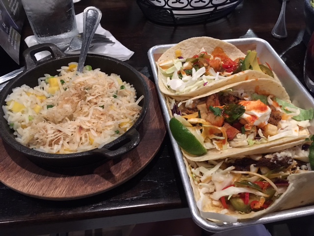 I got the potato chorizo, braised beef and spicy shrimp, along with a side of mango cilantro rice. The spicy shrimp was definitely my favorite, it was for reals spicy – but in a you’re-killing-your-taste-buds-for-good-reason kind of way. I thought I would like the beef the best but when it turned out that it was primarily jalepenos, I decided that wasn’t so much a winner. The rice was delicious.