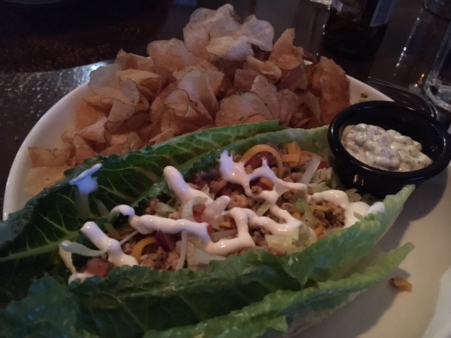 I got the chicken tacos for my meal, only replaced the tortillas with a lettuce wrap. I guess I’ll be playing the part of “healthy Shane” this evening. Although I did get the homemade chips and dill dip as my side, too, so there’s that.