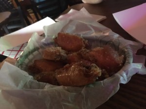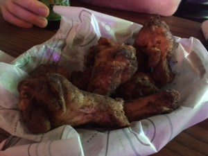 But going back to our usual array of unhealthy entrees … the wings were huge. And apparently baked on the surface of the sun, as Ted discovered the hard way. Both Ted and Shane agreed that the wings were too salty. The Jamaican jerk was OK as a seasoning, Ted said he wasn’t used to that being a dry rub but it was alright. Shane said his wings were definitely garlicky and he’d not be able to get that taste out of his mouth for some time.