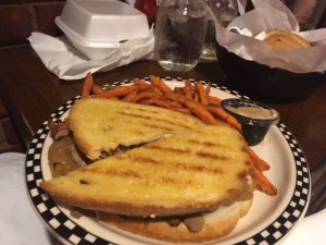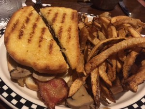 Cassi and I each got the “Big John” angus burgers. Which didn’t seem all that big when they actually arrived. Interesting. They were also missing cheese. I guess maybe Ted’s request of no cheese translated to all of us? Yeah, no. The server took them back, and they added cheese to the burgers … and stuck the plates under a hot lamp to melt it. Which kind of ruined the burger by making it more well done and dry, and the bread taste weird. I didn’t eat the bread at all, which if you’ve been following along here you know is something you hardly ever hear from me.