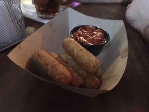 That’s like a pound of tater tots loaded with beer cheese and bacon. Meanwhile, we get five mozzerella sticks that seemed to be poured directly out of a freezer bag into the deep fryer. Seems fair.