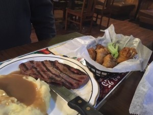 In the time-honored battle between steak and AYCE fish (which they apparently offer as a menu item every day here?) Ted decided on steak. Specifically the steak special, which is a 6 oz steak plus choice of potato and a salad for $6. And of course a side of six wings, because, well, there wasn’t enough food at our table already.