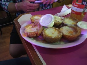 Cassi and Jason ordered the potato skins for their app, after the server described them as “little potato cups of cheesey goodness.”