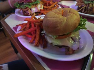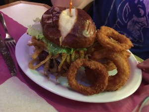 Since OBVIOUSLY this steak special didn’t meet his expectations, Shane followed the server’s recommendation that the burgers were outstanding and ordered the Bourbon Burger. As did Jason. To prove they weren’t twinsies, Shane got onion rings, and Jason got fries. Cassi also went with a burger – the bacon Swiss – with sweet potato fries.