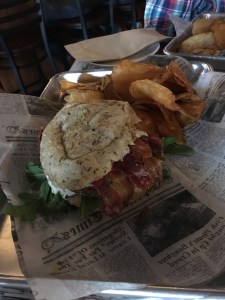 The menu is also pretty much what our group would consider to be “fancy,” especially when served in combination with beer. I mean, they have the staples like burgers and salads, but they throw you off with culinary vocabulary like “spent grain bun,” “Vegan brioche bun,” and “pork belly croutons.” In particular the Arugula Goat Cheese Toast Salad sounds like something my fried-food-loving body would run screaming in the opposite direction of, but whatevs. But then they also have highly intriguing – read: sounds less healthy – things like a Pork Belly BLT, Ghost Pepper Mac and Cheese, and Nashville Hot Chicken. Huh.