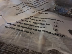 Apparently they also have flights of beer, so you can try samples of the different offerings before you commit to a giant 16oz glass of something that maybe tastes like burnt coffee and motor oil. But we weren’t aware of this until we saw one getting carried away from the bar to a neighboring table. File that under: things we wish they had advertised in some way.