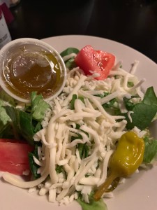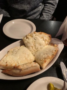 Cassi got an 8 cut pizza – pepperoni and mushroom, with banana peppers on half – and a side salad. She also got a side of the cheesy garlic bread.