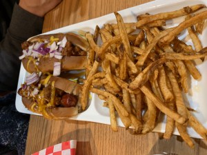 Jason got the aforementioned Cowboy Burger, and also an order of Coney dogs. The server explained – probably as she realized Jason was essentially ordering two full meals just for himself – that the Coney dogs weren’t anything to sneeze at, the order was actually two large-ish dogs and a full order of fries. So, yeah, a crapload of food.