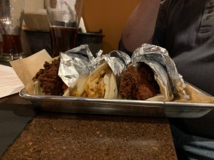 Ted got three tacos – one of the Buttermilk Fried Chicken tacos from the House Specialties section of the menu, and then two tacos that he created himself – a blackened chicken with pineapple, and a fried chicken with Verde sauce.