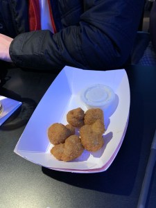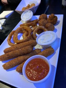 Jason got the same order as Shane. Because, well, them. He and Cassi also got the fried pickles as an app, and then a little later – after realizing the pickles only came a few to the order – the breaded mushrooms.Which also arrived seemingly a little on the skimpy side portion-wise, but I guess for under $5 you really can’t complain all that much.