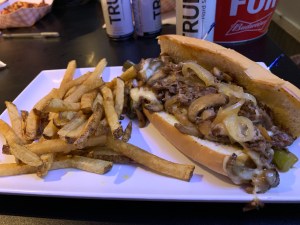 Onion rings were the only thing in that whole mix that I wasn’t crazy about. The other items on the app platter were good, as was my sandwich – although I did eventually just eat all of the steak and cheese off of the bun, but at least it was just because it was too much food and not because it didn’t taste good. And I used a fork, I’m not a complete heathen.