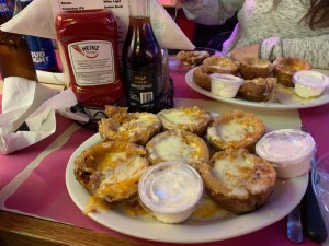 Another blast from the not-so-distant past – potato skins. A quick check back on our post from the last visit affirmed that they were what made mouths water when Cassi and Jason ordered them the first time around. OK, well, I guess mine and Shane’s anyway, since I have to believe that in Ted’s mind this is pretty much the picture of what hell would be filled with.