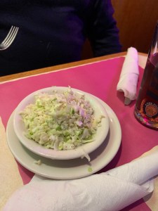 Our server asked Shane as he was ordering this dish if he was OK with the sides that come with it – which are cole slaw, hot rice and fries. Shane just nodded. Sounds good.
