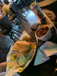 Ted got the perch sandwich and a crock of chili. I seriously think his internal calendar is a little off. I’m not even sure why chili is on a menu in late May, but I would be a little wary. Clearly Ted is a man who takes chances.