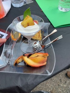 What happens when you let a catering truck give you dessert? Well, let’s just say you definitely get points for presentation and originality. Robestos served us up a little platter of delightfulness, including tiny bite sized portions of yogurt, peaches, waffles and a sidecar of syrup. And guys, tiny plasticware. I mean, come on.