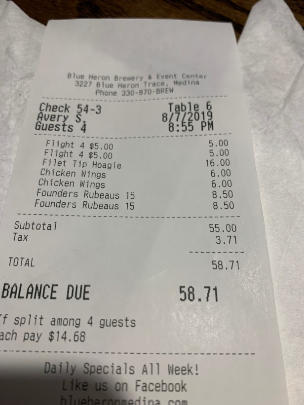 If you look at that and think it’s not so bad, keep in mind that the wings and the flights were both on special. Those $8.50 charges are the individual beers that Shane and I had after finishing off our flights.