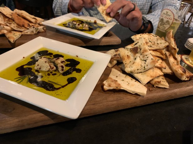 Our bounty of bread and oil was arguably the best part of the meal. Props to the server who told us to smash the garlic cloves into the oil rather than out previous method of attempting to eat them an entire clove at a time. And the bread was really flavorful. While it didn’t soak up the oil entirely, the taste of the bread alone made up for that. It was like those pita crisp crackers turned into a full piece of bread.