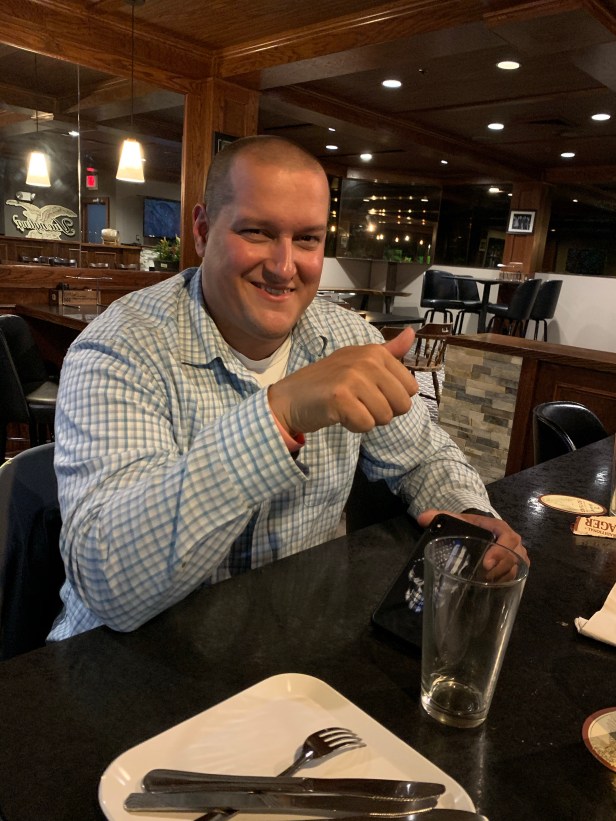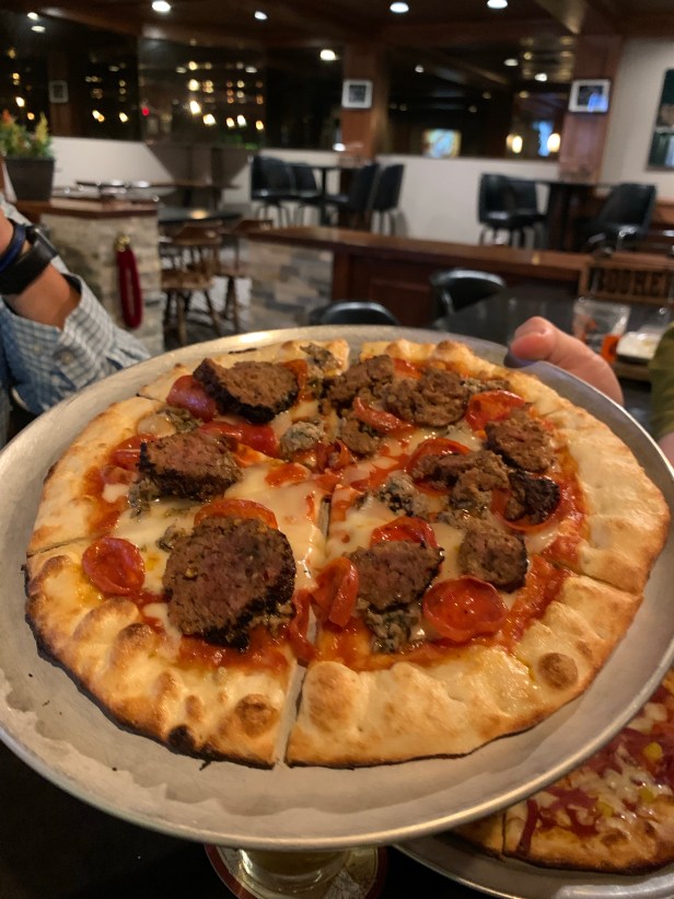 He chose sausage, pepperoni and meatballs. It had minimal cheese, by the server’s admission because of all the meats covering it. To which we all replied in a resounding chorus that that’s exactly how Ted likes it.