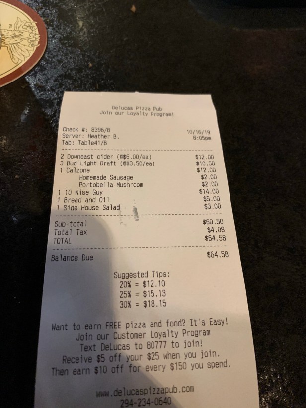 Which may dovetail into our second issue … price. I mean, we get the whole fresh-made thing. And we both enjoy and appreciate that. But, well, paying $14 for a just a step above personal pan pizza and $6 for a draft cider was a little bit disheartening. Maybe in NYC that flies, but not in Green, Ohio.