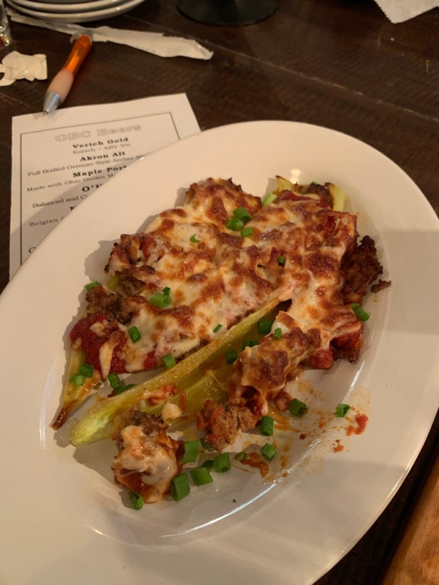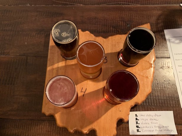 Well, it’s a brewery, so it only makes sense that we started out with flights of beer, no? Bonus that they arrive on really cool wooden Ohio-shaped plates. Which then afford us the opportunity to pass judgement on various portions of the state based on the type of beer that was placed in that part of the plate.