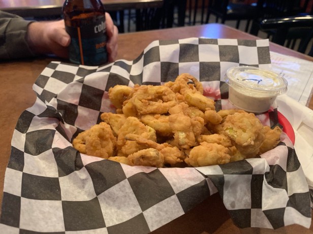 Shane still wasn’t convinced, though, until we sat down (not in the same booth, but on the opposite side of the restaurant) and opened the menus, and he immediately zoned in on something called “bottle caps.” Which happen to be deep fried jalapeños.