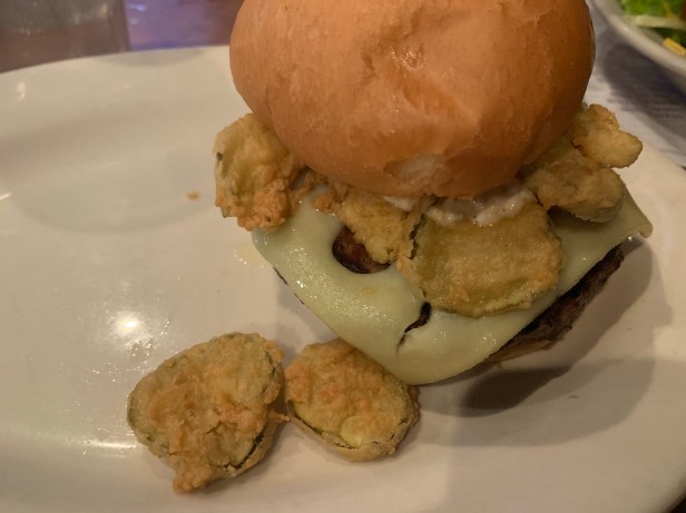I got the fried pickle burger – which is exactly what it sounds like, a burger with fried pickles on it – and a side salad.