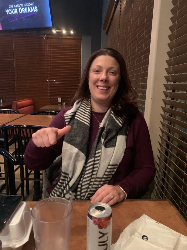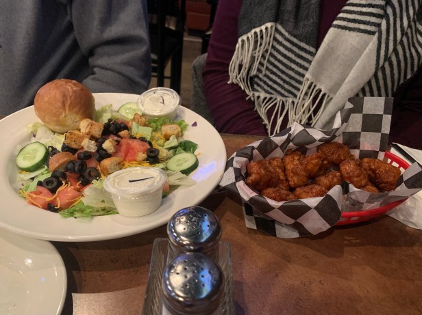 Cassi said the wings were pretty spicy, but also very good. She also got a little extra mental energy burn as she spent about five minutes extracting all of the olives that she didn’t know would be on her salad. Fun times.