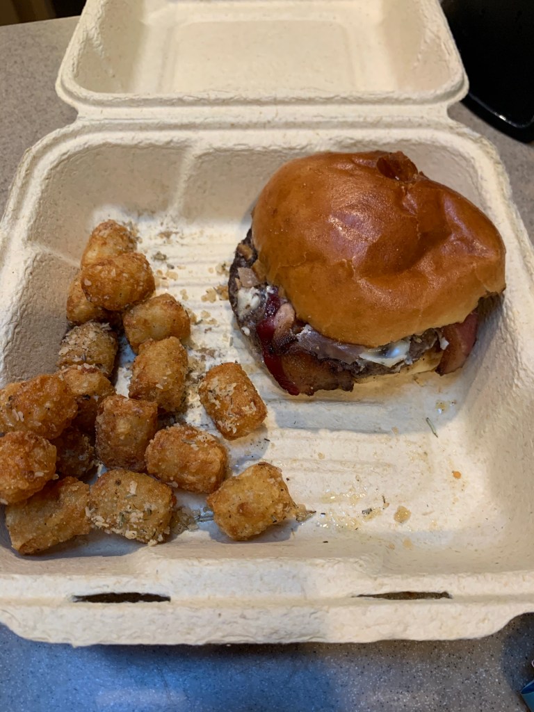 I mean, I get that plating food for take out vs dine in loses a lot of points for presentation. There’s only so much you can do once you lose the cute little tin pails or mini mesh fry basket replicas that apparently normally house the now-realized obscenely small number of tater tots you have to pay an upcharge to consume. But like either downsize the to-go box, or – more preferably – throw a few more tots in there to make up for the whole take home experience. Because 16 tater tots (and I know it’s that many because, well, I can clearly count them in the photo. You can too. It’s a new party game!) is not exactly worth an extra $3 over the already somewhat high $13 cost of the burger. Even as a free side I would look at that and wonder how I missed the news of the most recent potato shortage, or whatever the latest 2020 reason is for why we can’t have nice things anymore.