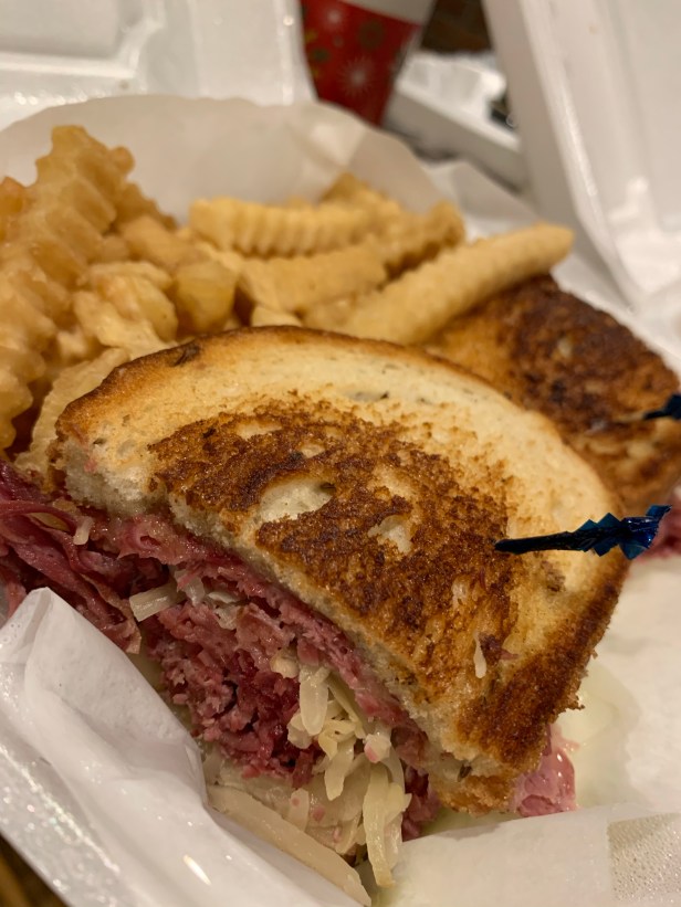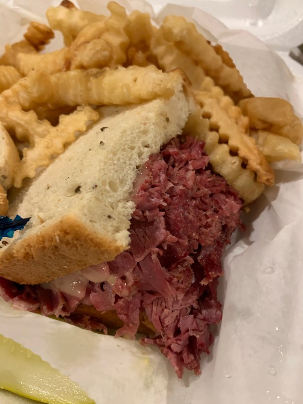 Luckily we were back in sync on our sandwich orders, with Shane getting the Classic Reuben, and me getting essentially the “dressed down” version of the same meal, a corned beef deli sandwich with an added piece of Swiss cheese.