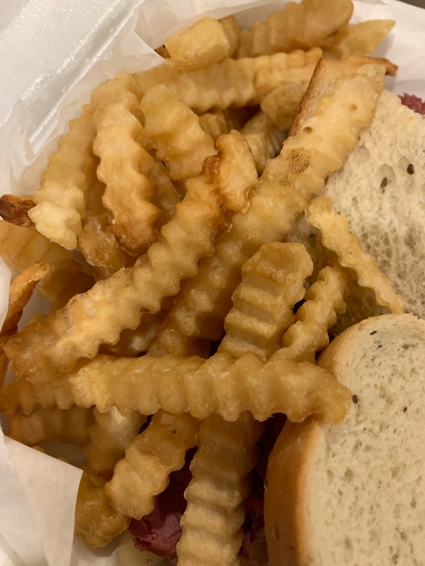 We both subbed in fries instead of chips for both ($1.75 extra each), which was a decision well made because we discovered upon opening the takeout boxes that they’re actually … crinkle cut fries.