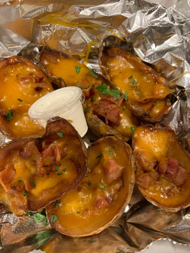 So in the ever present couples debate of “what should we share for an appetizer?” tonight’s winner was … potato skins.