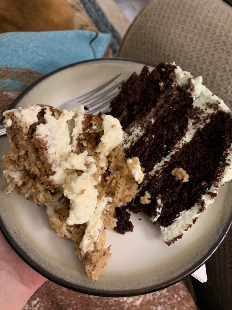 However, lest you think we were forced to actually go without dessert entirely this evening (the horror!), we were told that they still had a few slices of a Thin Mint cake left, as well as Hummingbird (which, if you’re like us and didn’t know how the name of a bird could translate into a dessert option, is a banana and pineapple cake with cream cheese frosting … you’re welcome), so the crisis was averted.