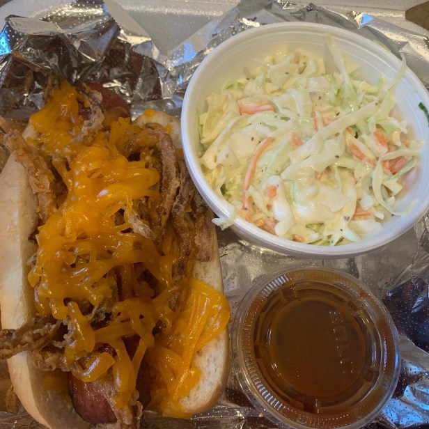 Shane got the all beef hot dog. Which if you read the menu sounds like it should be just exactly that … but then flip over to the Land of 1,000 Options and surprise! – you can pick some toppings, too! So he added onion straws and cheddar cheese. Because, again, why not.