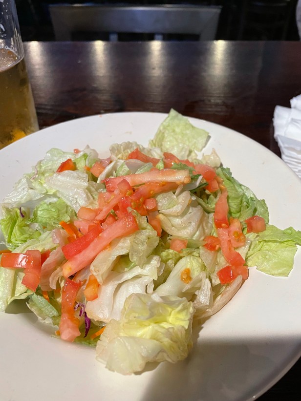 My side salad arrived with the apps. And I hate when that happens. Even more so when it’s the saddest salad I’ve probably ever seen. It was basically some wilted lettuce and some mushy tomatoes. Sounds delicious, I know. I mean, I’m sure glad I was upcharged for this and all.