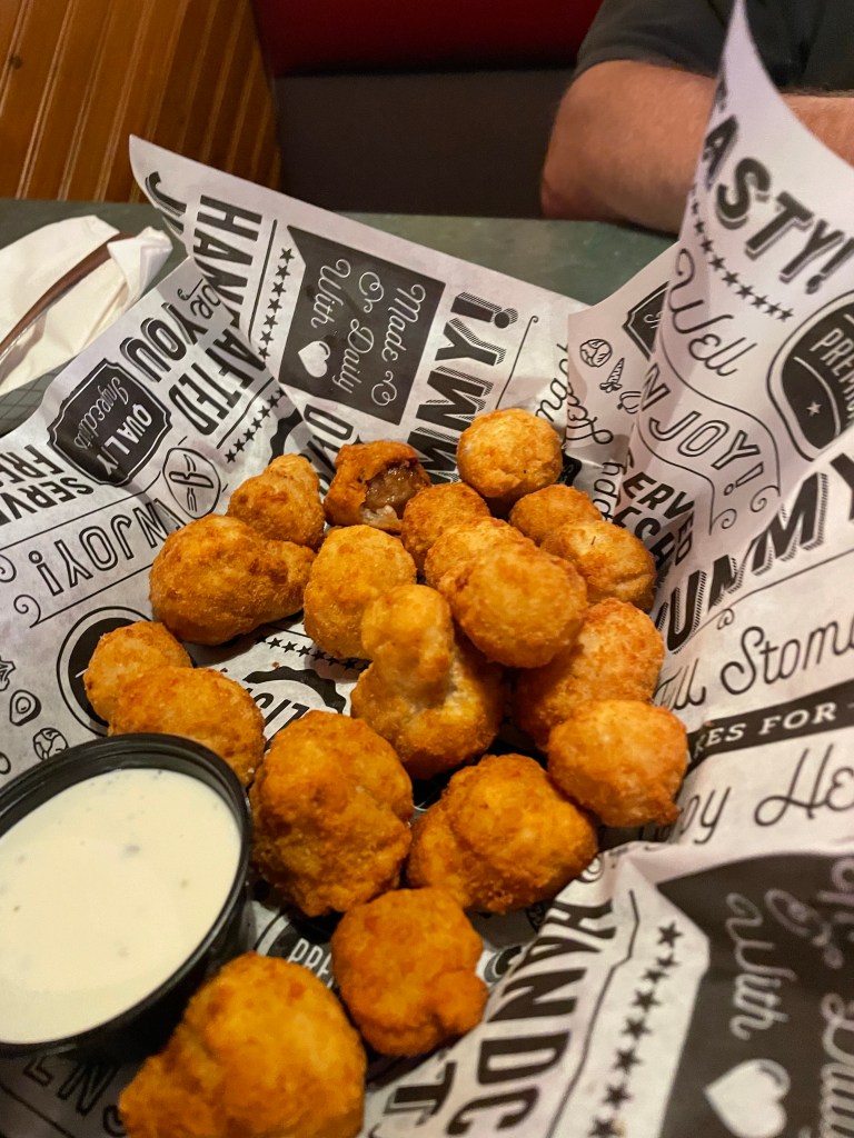 Shane was also sold on the club mix, so add another 10 to those at our table. And 10 of the hot garlic. And some fried mushrooms.
