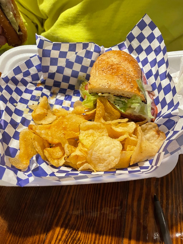 So we order, we drink … and the pretzels show up … and then mine and Shane’s food arrives. And we started picking at it. And by picking at it I mean Shane ate all of his chips and half of his sandwich, while I ate my chips.