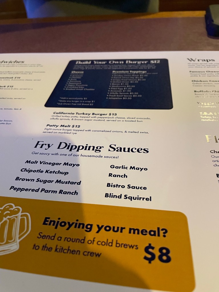 I decided to build my own burger with Amish smoked cheddar cheese, bacon and mushrooms. The guys made a fun game out of trying to guess what condiments I would pick from the list on the menu.