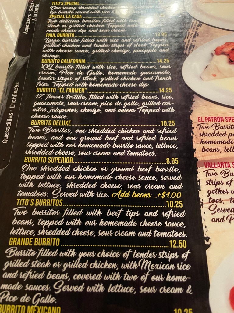 I ordered the Tito’s Burritos, which are two burritos with steak tips and refried beans covered in cheese sauce.