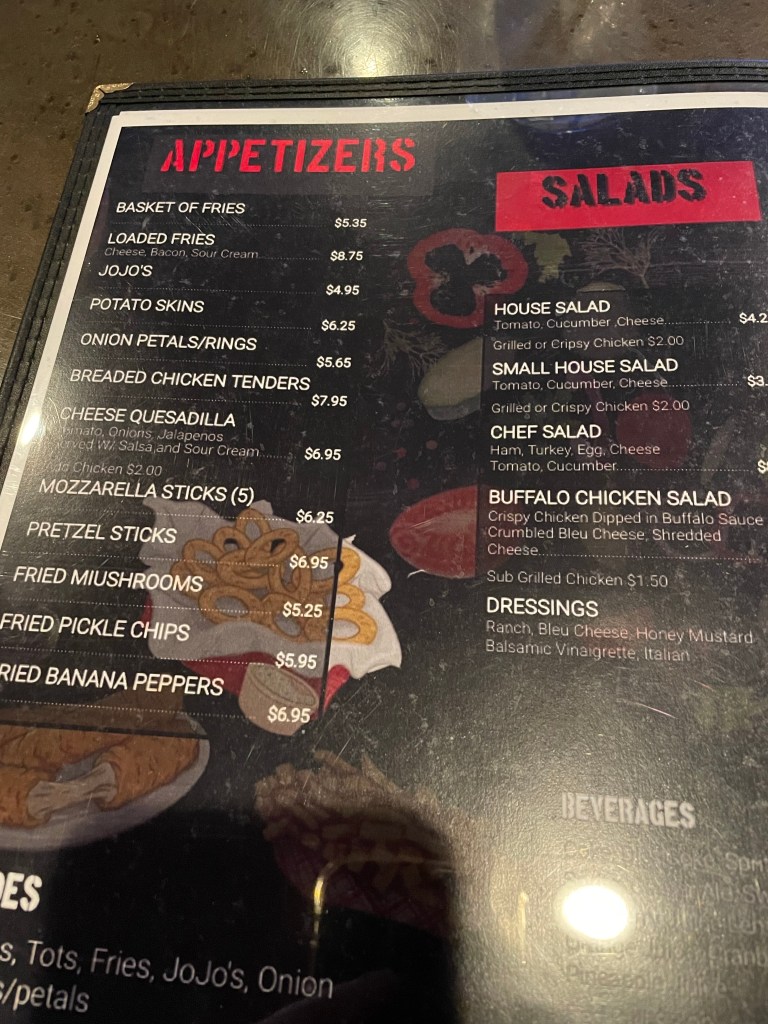 This definitely seems to be one of those times we should’ve branched out and tried something that we haven’t had at this particular place before, right? I mean I guess this serves us right for cracking the same joke about burgers and wings at the Springfield Tavern all these years … and then they give us more options but yet that’s still what we order. We’re nothing if not predicable, no?