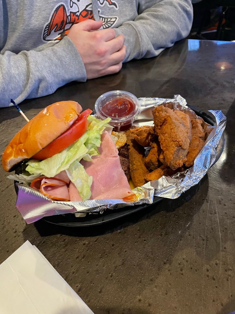 Yes, those are breaded potatoes next to his sandwich. Although they look suspiciously like wings, I know. Ted said they were similar to extra crispy KFC breaded jojos – they were very thick, but good.